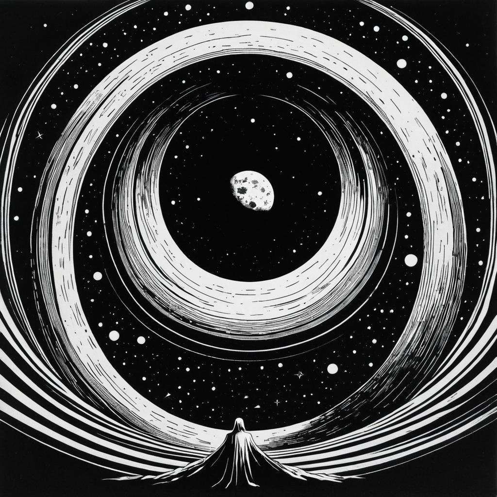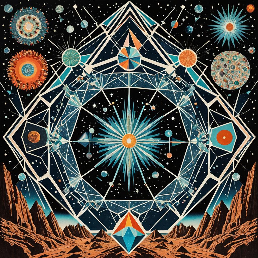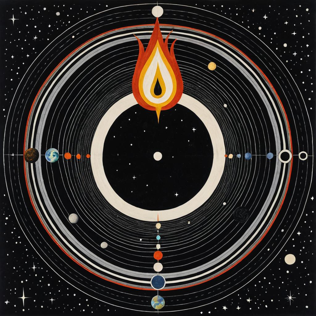 Abstract cosmic-themed artwork inspired by Hilma af Klint, featuring celestial bodies arranged around a central circle with concentric orbital paths. The piece portrays a cosmic dawn, combining elements of astronomy and mysticism, highlighted by a flame-like shape at the top center. The background is deep black with scattered stars, emphasizing the universe's vastness.