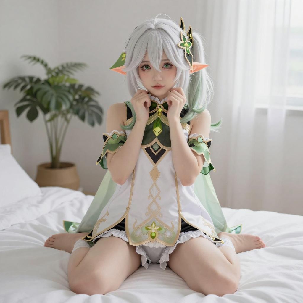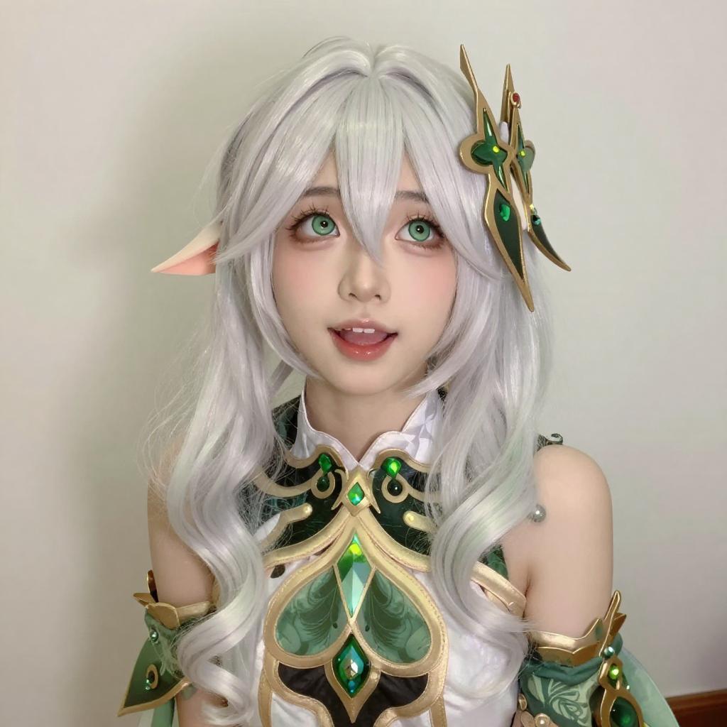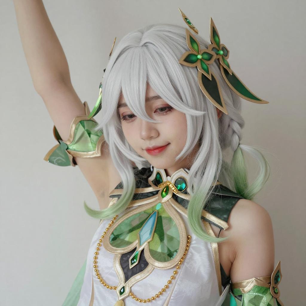 Digital artwork of an anime-style woman with long, white hair and green eyes. She wears a gold headpiece, green leafy accessories, and a revealing, gold-chain adorned top with a green gem necklace. Her right hand touches her head, and her left arm is raised. Her expression is slightly seductive, with red lips. The background is white and blurred.