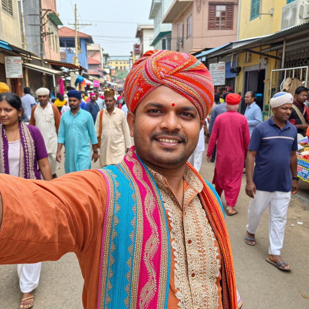 Photograph of a smiling Indian man in vibrant orange kurta and red turban, adorned with blue and pink embroidery, taking a selfie in a bustling