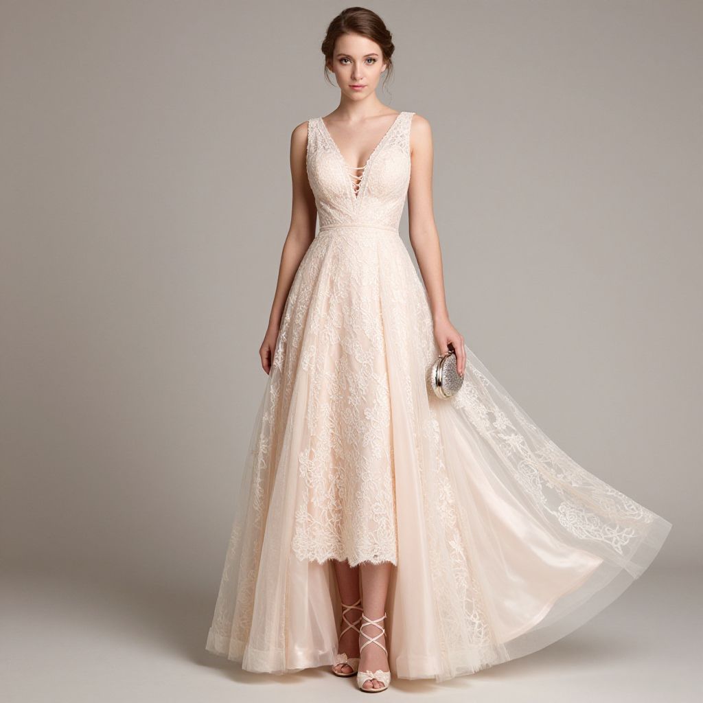 Photograph of a fair-skinned woman in a white lace, V-neck, sleeveless wedding dress with a flowing skirt and white strappy heels.
