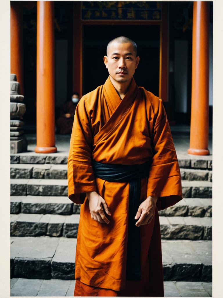 Portrait of an Asian Buddhist monk dressed in traditional orange robes with a white belt, walking through a temple corridor with stone flooring and red pillars. The background shows an ornate golden door and another monk in orange robes standing near the entrance. The setting is a serene and historic Buddhist temple with traditional architectural elements.