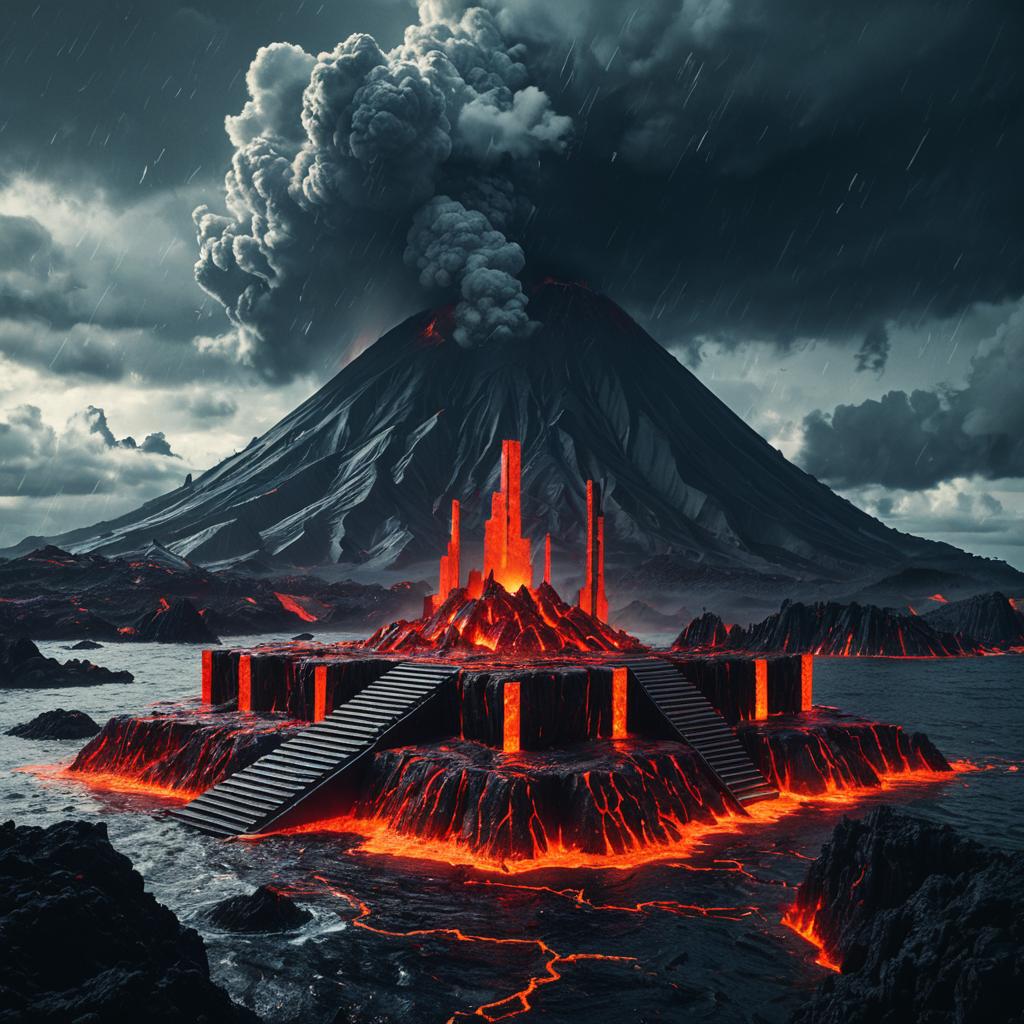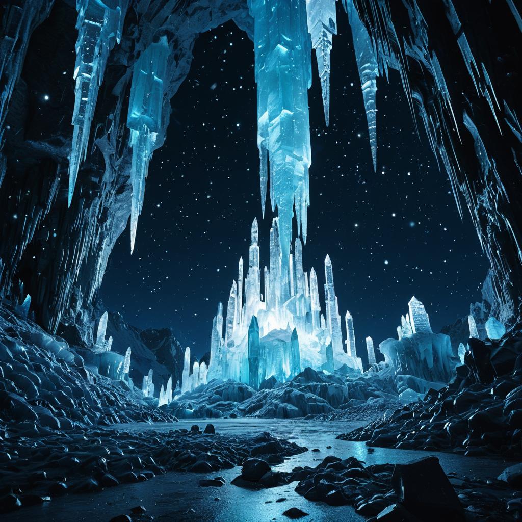 A Beeple-style render of a starlit ice cavern, featuring crystal stalagmites, glowing frozen flora, set under deep indigo sky with shooting stars, captured with 90mm lens, super-resolution, hyperrealistic, cinematic, intricate, and surreal
