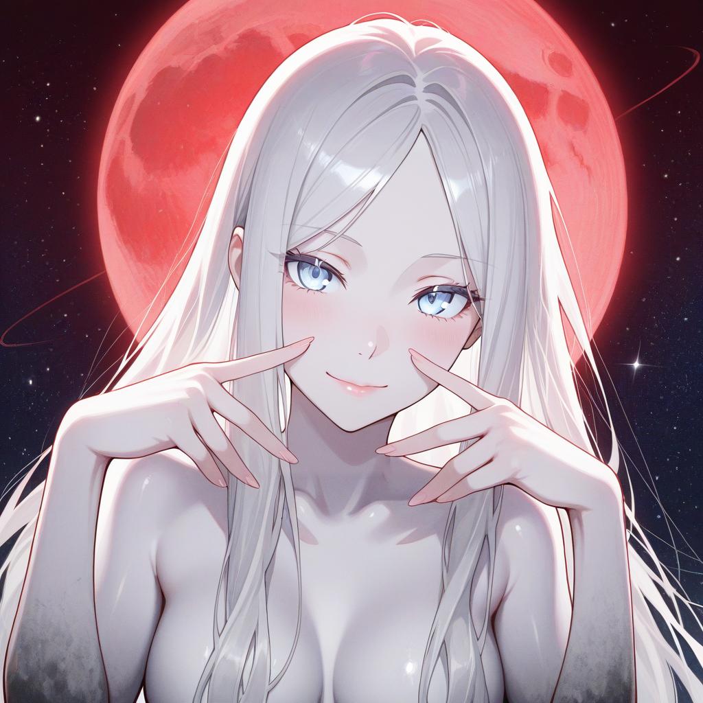1girl, beautiful face, ((white eyes)), sexy pose, Red moon in the background, stars, space, (lightroom:1.13), soft light, (natural skin texture:1.2), (hyperrealism:1.2), sharp focus, focused