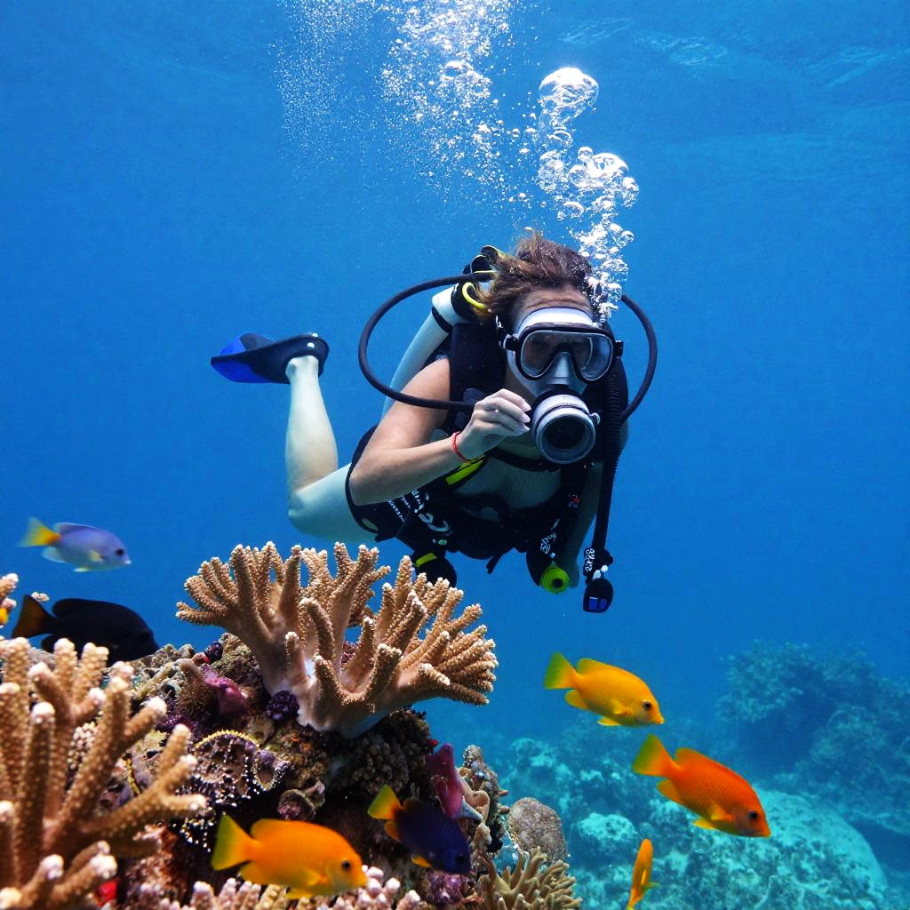 Graceful Scuba Woman Among Tropical Fish