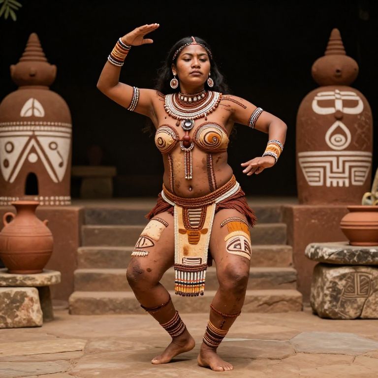 A powerful tribal dancer performing in a ceremonial setting, her body adorned with hand-beaded patterns that replicate the textures of the earth—beige, mud-ochre, and dark brown—with tribal motifs inspired by ancient cultures; she has a tanned, athletic build, a broad forehead, and a fierce yet calm expression, dancing on a stone platform surrounded by painted clay shrines and natural earth elements like clay pots and stone altars.