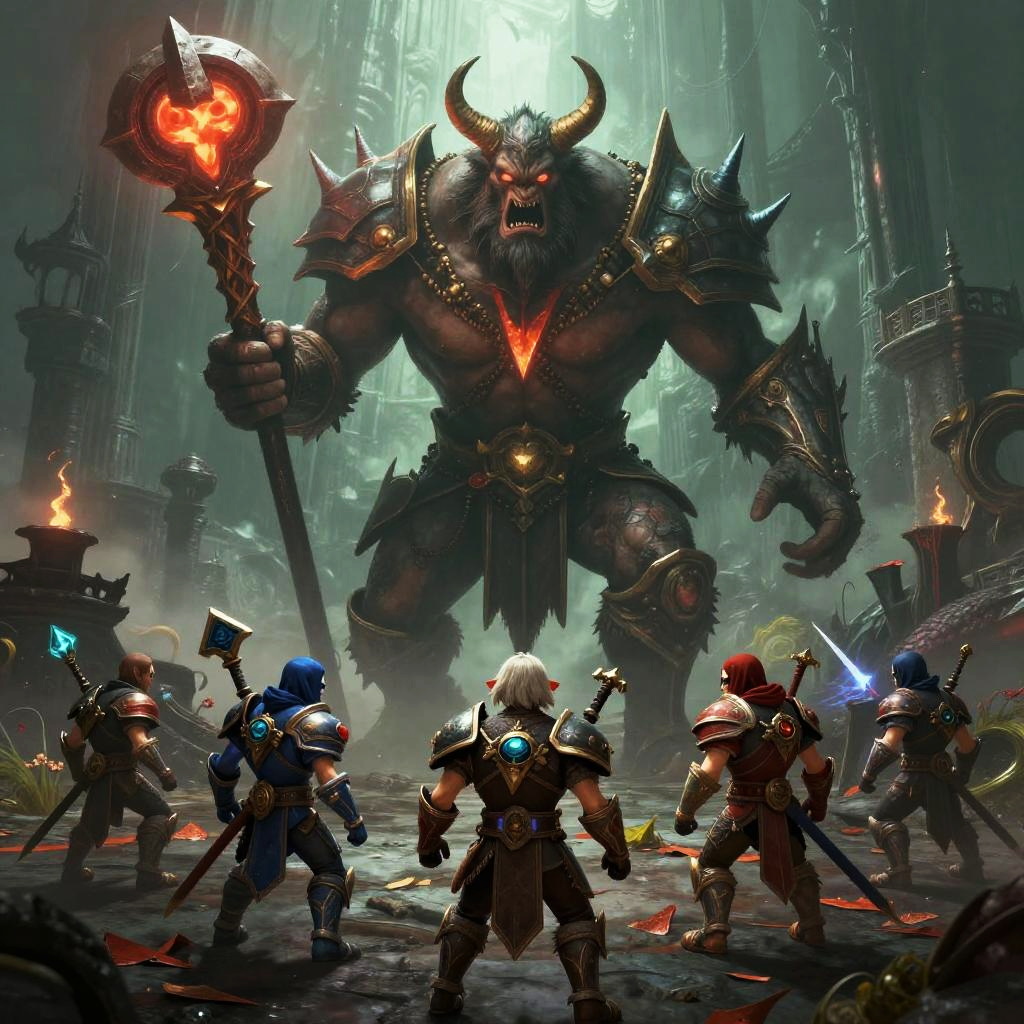 Diablo IV meme depicting a group of players facing an enormous boss with funny oversized weapons and quirky facial expressions, set in a gothic, hellish landscape.