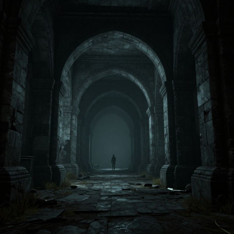A hauntingly atmospheric 3D-rendered scene depicts a desolate pathway leading through massive stone arches, reminiscent of ancient ruins, with a solitary figure standing at the far end, evoking a sense of mystery and abandonment under dramatic lighting that enhances the eerie, cyberpunk-inspired ambiance.