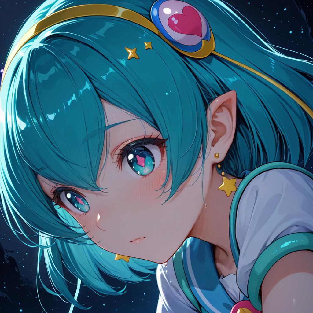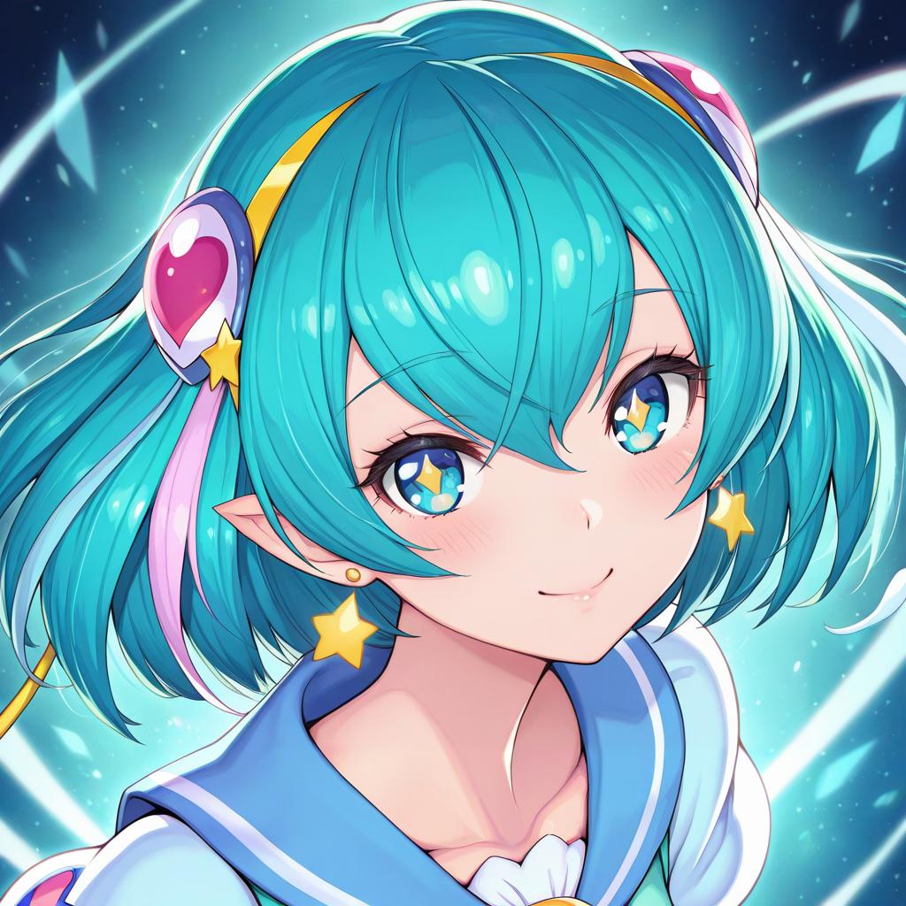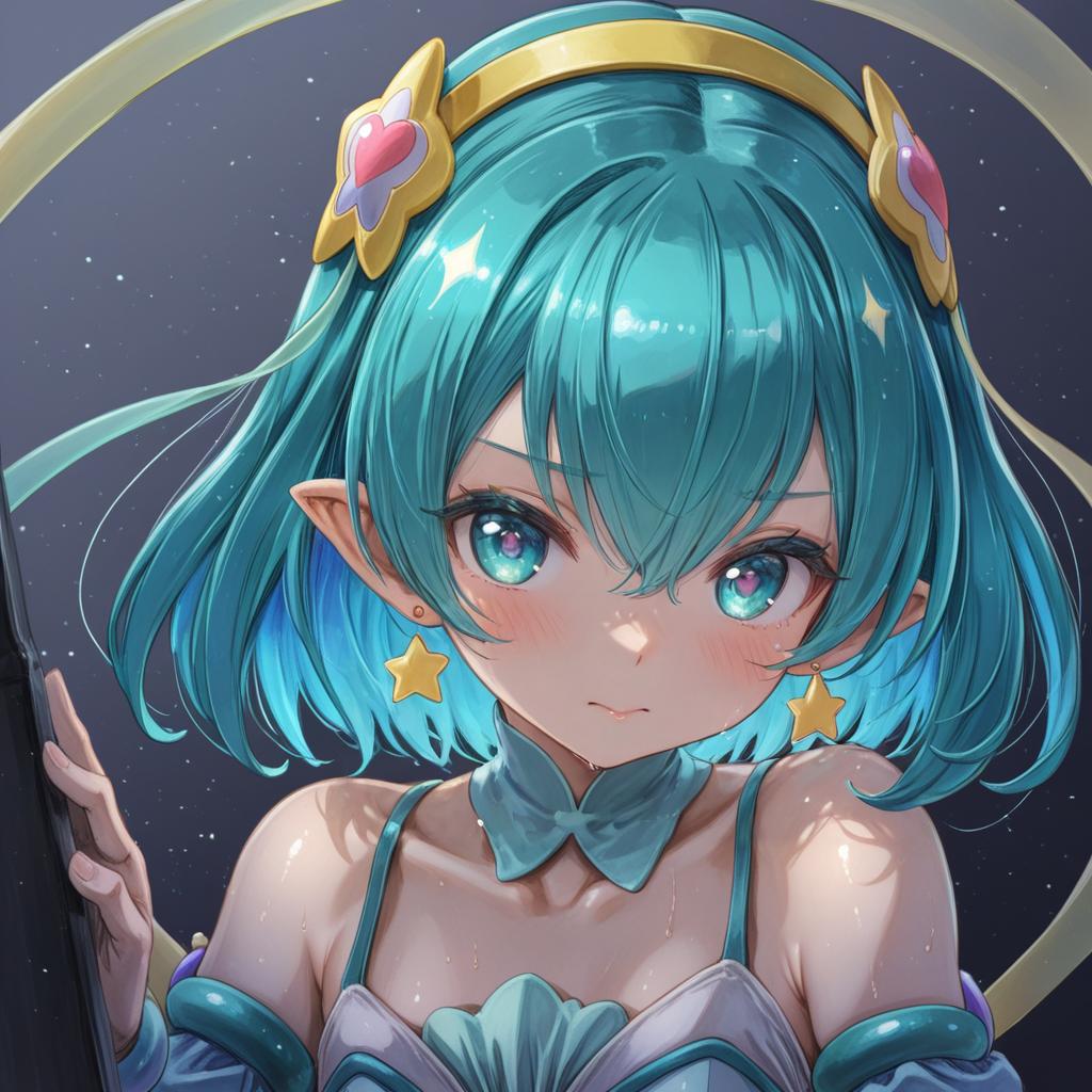 A close-up digital illustration of a magical girl character with short aqua blue hair, aqua eyes with star-shaped pupils, and pointy ears. She wears a yellow headband with a star ornament and matching star-shaped earrings. The character features a white and aqua sailor-style outfit, typical of the magical girl genre. The background is dark with subtle starry effects, enhancing the mystical and enchanting atmosphere.