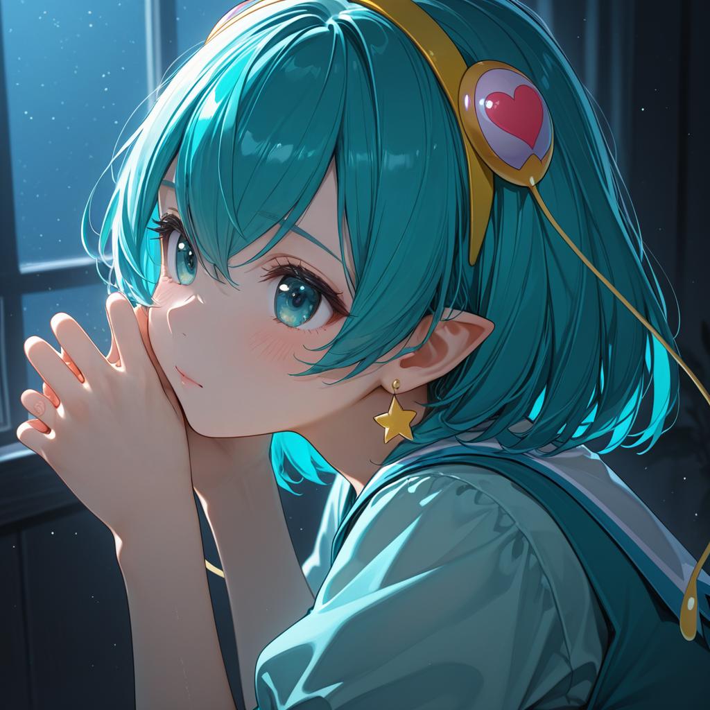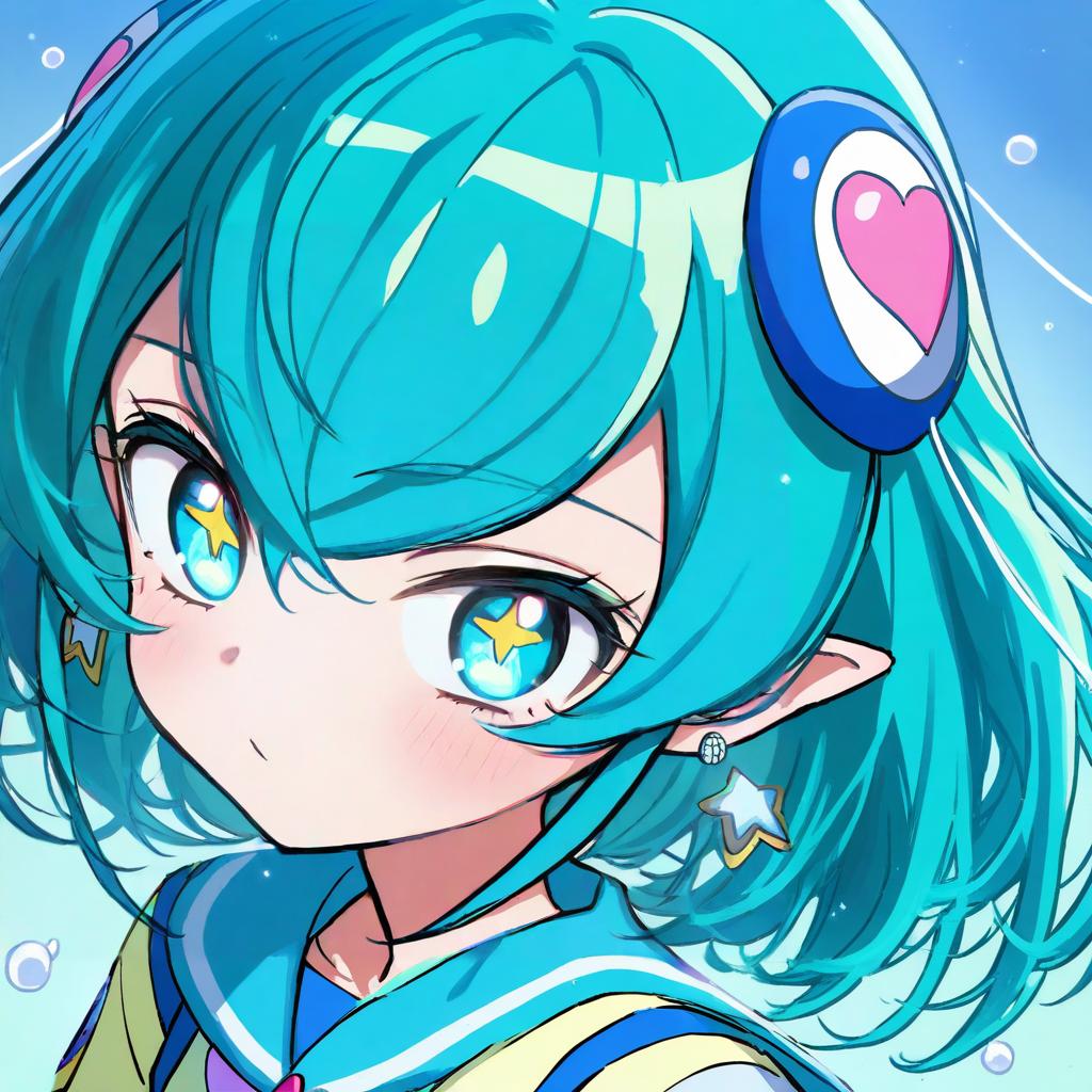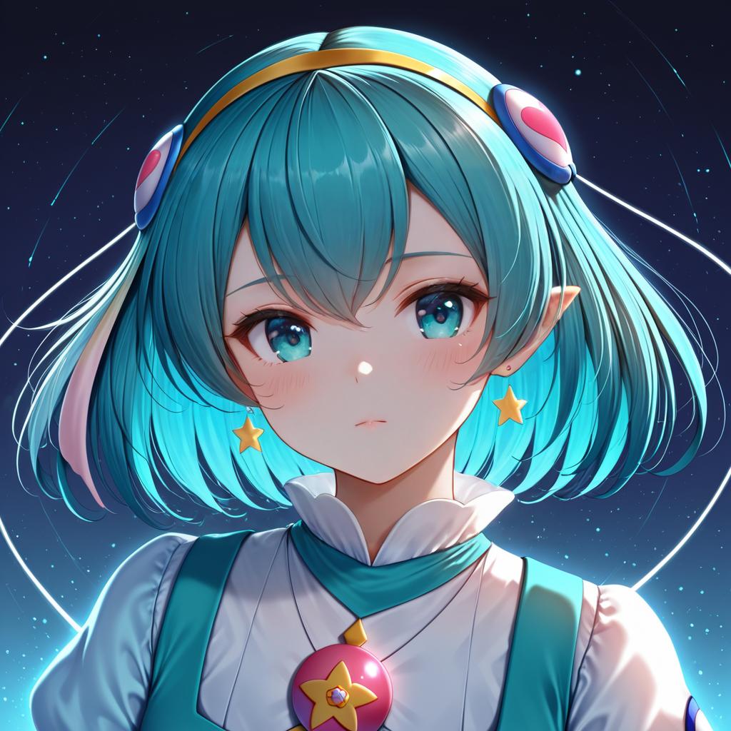 A close-up digital illustration of a magical girl character with short aqua blue hair, aqua eyes with star-shaped pupils, and pointy ears. She wears a yellow headband with a star ornament and matching star-shaped earrings. The character features a white and aqua sailor-style outfit, typical of the magical girl genre. The background is dark with subtle starry effects, enhancing the mystical and enchanting atmosphere.