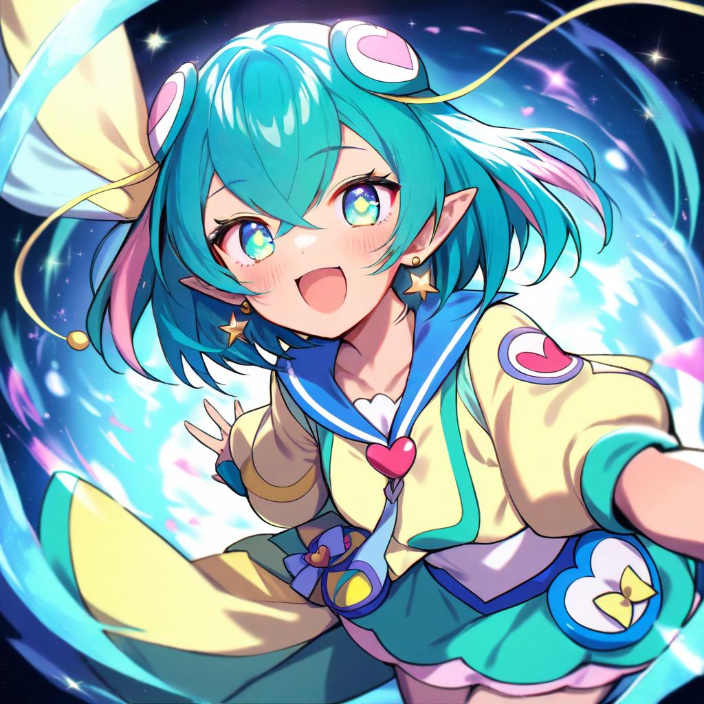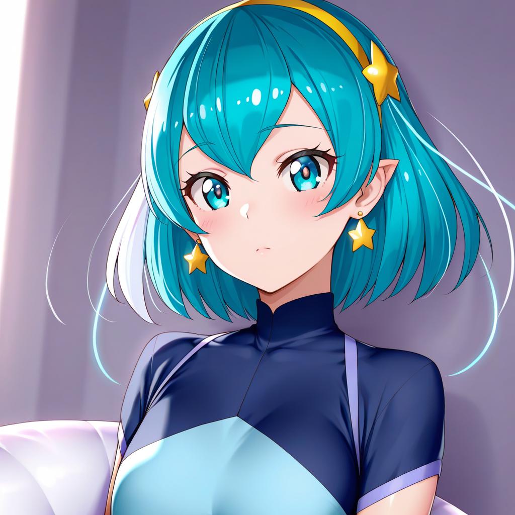 Hagoromo lala, precure, 1girl, pointy ears, aqua eyes, blue eyes, hair between eyes, star-shaped pupils, aqua hair, short hair, blue hair, star hair ornament, yellow hairband, star earrings, magical girl, magical girl, by artist gin'ichi (akacia), dark_illustrious
