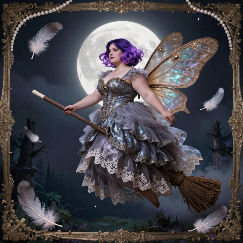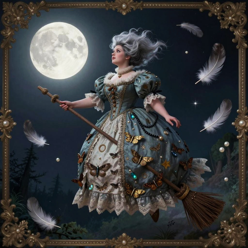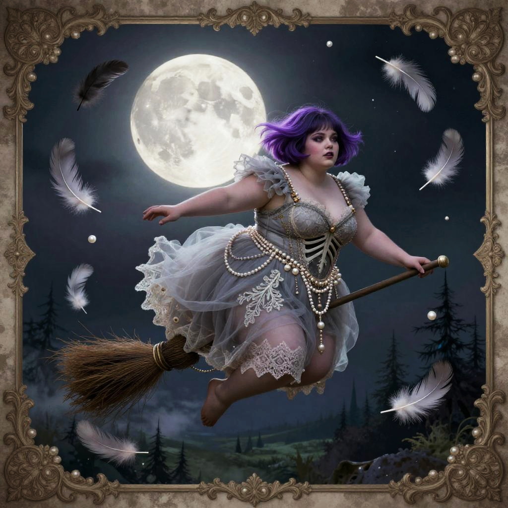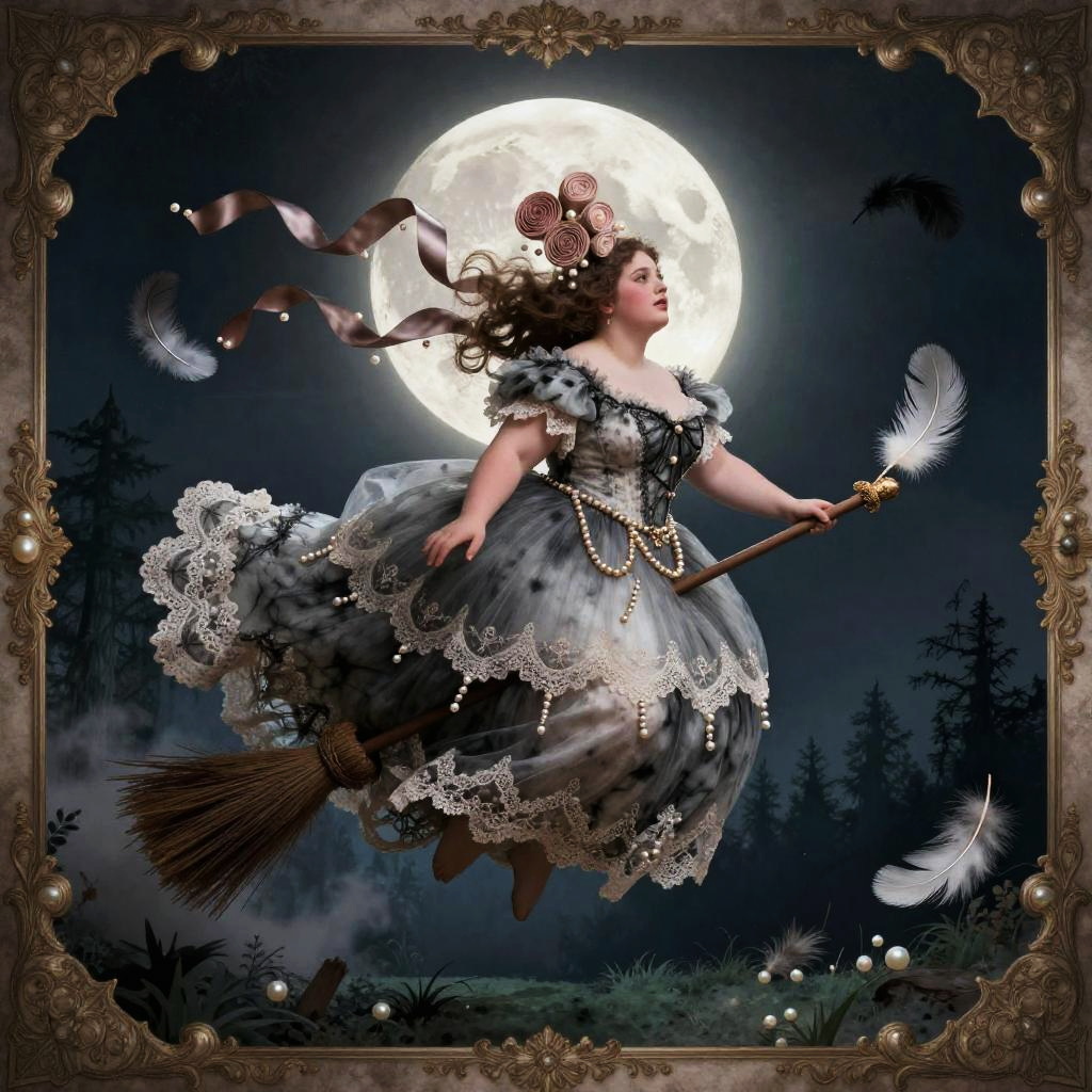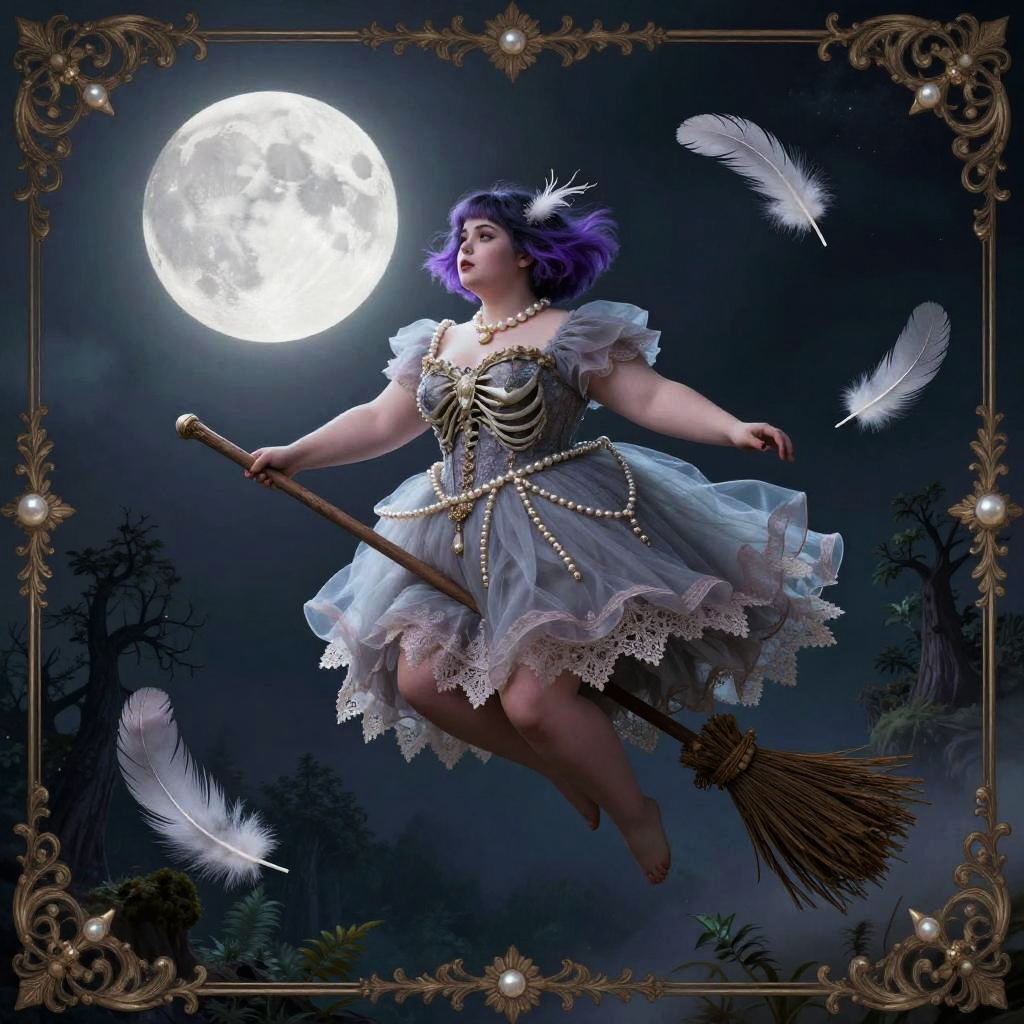 A whimsical, gothic fairytale illustration of a plump and magical woman with short choppy bob with violet streaks and feathered ends, flying through a surreal night sky on a broom, surrounded by feathers and pearls, in front of a glowing full moon. She wears a voluminous layered chiffon bustle with skeletal lace appliqué and pearl tassels with delicate lace and ornate details, framed by an elaborate vintage border. The scene is rendered in a highly decorative style with muted jewel tones and a mystical forest below.