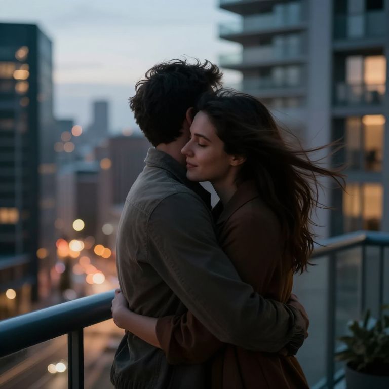 A modern urban apartment scene where a prompt couple hug occurs on a balcony overlooking city lights, wind gently moving their hair, affectionate and realistic, detailed fabric textures, city backdrop, Dall-E inspired aesthetics.