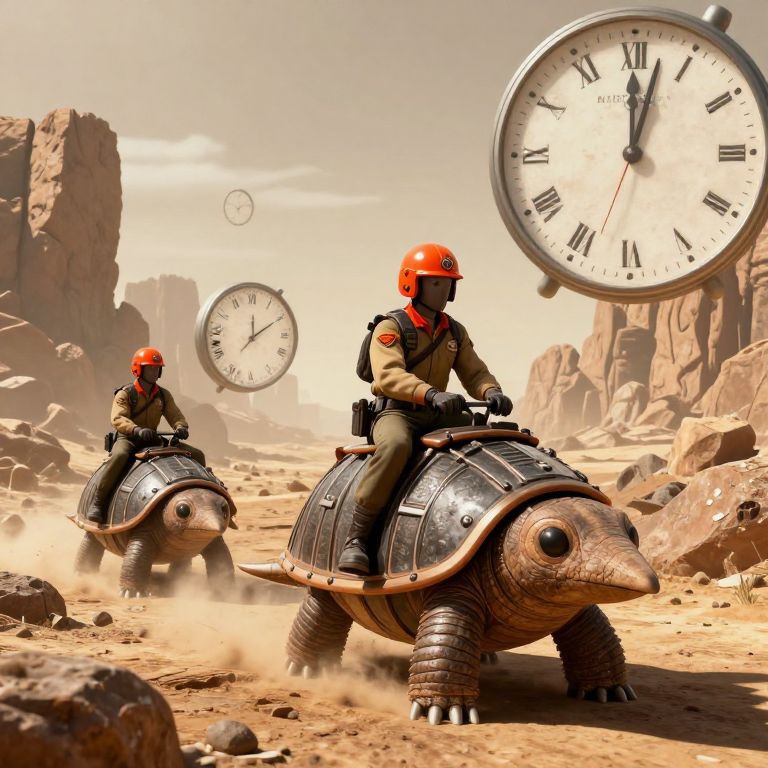 Photograph-style CGI image depicting two soldiers in tan uniforms and red helmets riding armored turtle-like vehicles through a desert with rocky formations. Each vehicle has a large, black, domed shell with textured, segmented sides. Two oversized clocks with Roman numerals float in the sky—one large clock in the top right and a smaller one in the center background. The scene is bathed in bright sunlight, casting strong shadows and creating a surreal, time-warped atmosphere. The soldiers are positioned in the foreground, moving from left to right, while dust kicks up around their vehicles.