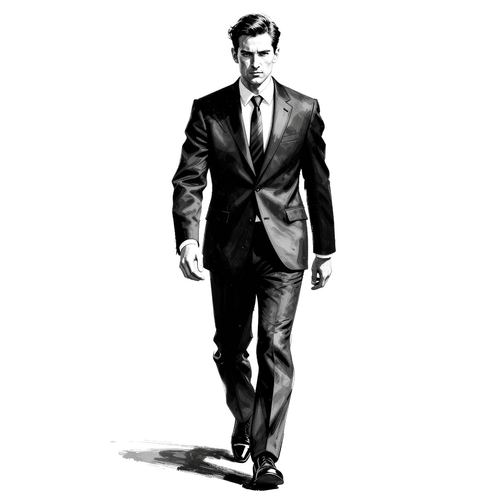 A bold black and white ink illustration of a confident man walking forward wearing a suit and tie. The dynamic brush strokes emphasize movement and strength, creating a powerful and stylish portrait with a strong contrast and minimalist background.