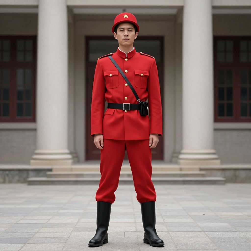 Photograph of a young Asian male soldier in a bright red uniform with a red cap, black belt, and boots, standing in front of a classical