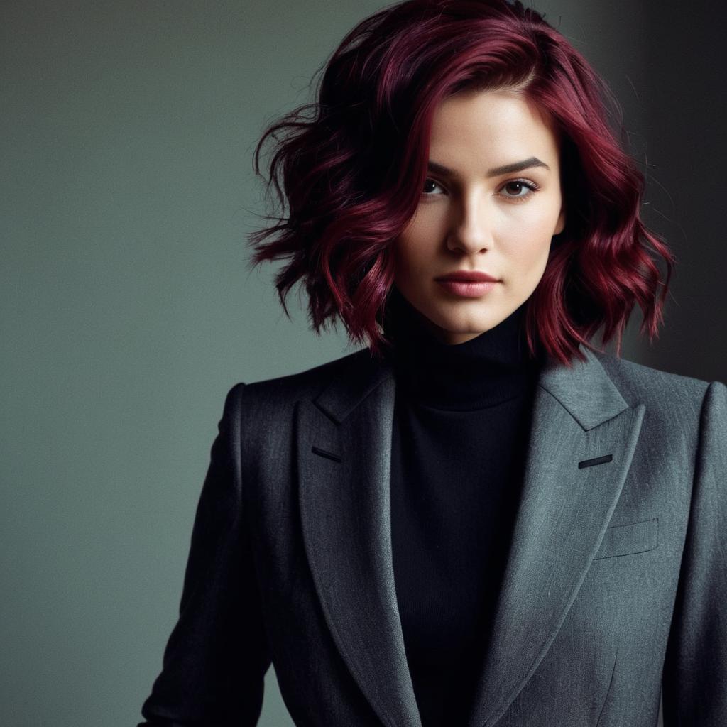 Burgundy hairstyle on fashion model, wearing elegant dress, in modern office, captured in fashion editorial style with moody highlights.