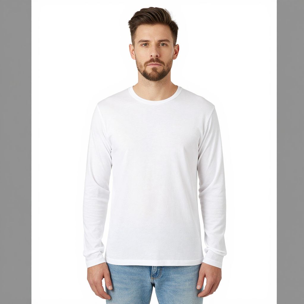 Photograph of a Caucasian man with a medium build, short brown hair, and a trimmed beard, standing against a plain white background. He is wearing a plain white long-sleeve shirt and light blue jeans. His expression is neutral, and he looks directly at the camera. The image is well-lit with even lighting, highlighting the simplicity of his outfit and the clean background. The overall style is minimalistic and modern.