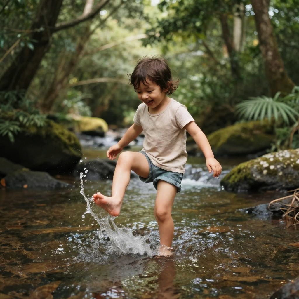 Barefoot pose of a child playing in a shallow forest stream, splashing water, sunlight dappling through dense trees, joyful expression, playful and whimsical scene with earthy tones