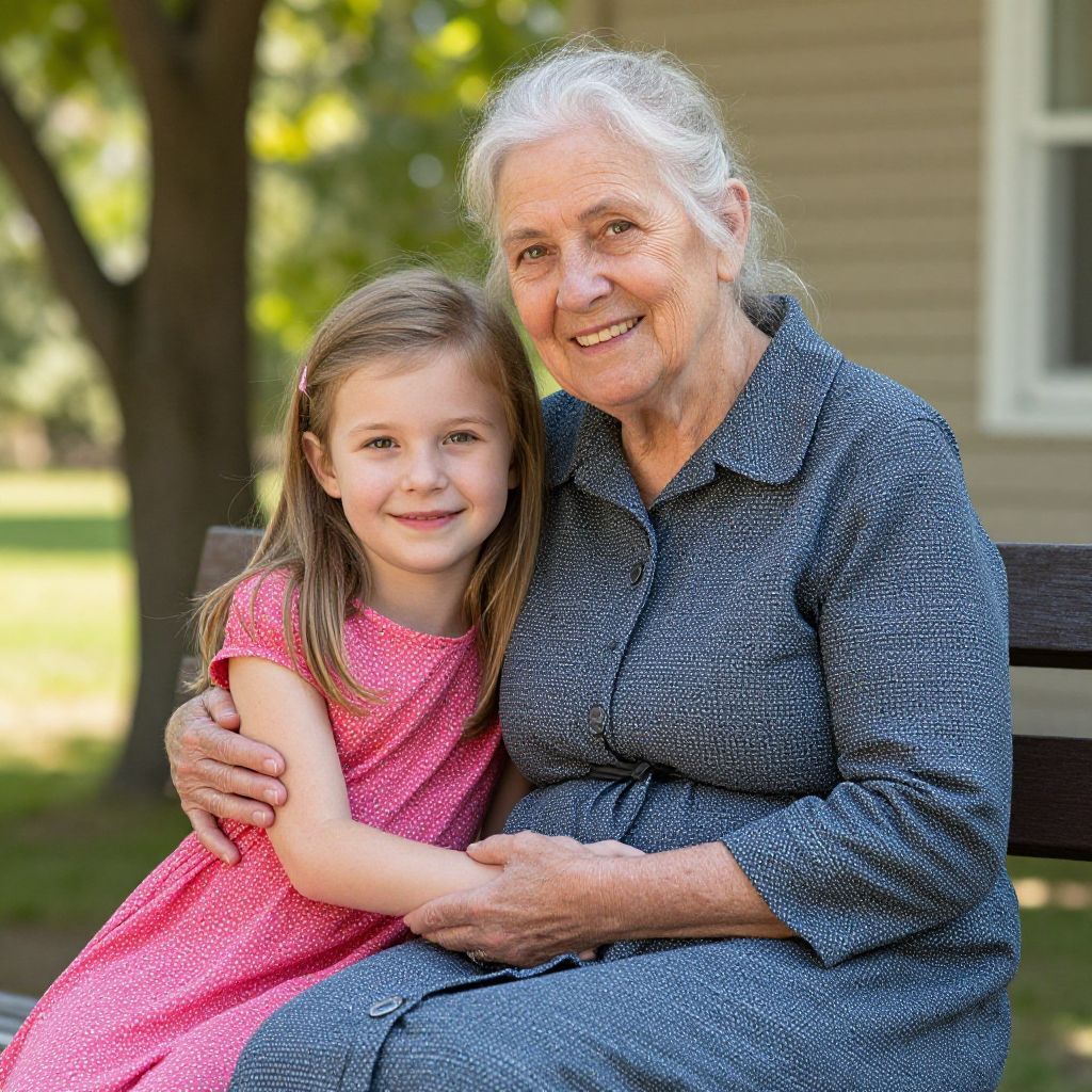 Photograph of an elderly white woman with white hair in a navy blue, textured, button-up dress, sitting on a black wooden bench, hugging a young white girl with brown hair in a pink, short-sleeved dress. The girl smiles warmly at the camera, while the woman smiles gently. Background shows a blurred, sunlit outdoor scene with trees and a beige house with white-framed windows. The lighting is bright, highlighting their faces and the textures of their clothes.