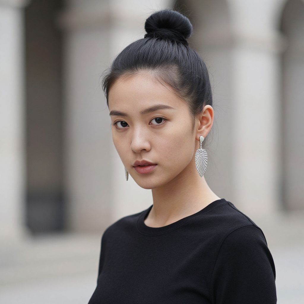 Photograph of an East Asian woman with fair skin, black bun hairstyle, wearing a black top and large silver leaf earrings, standing in a blurred urban