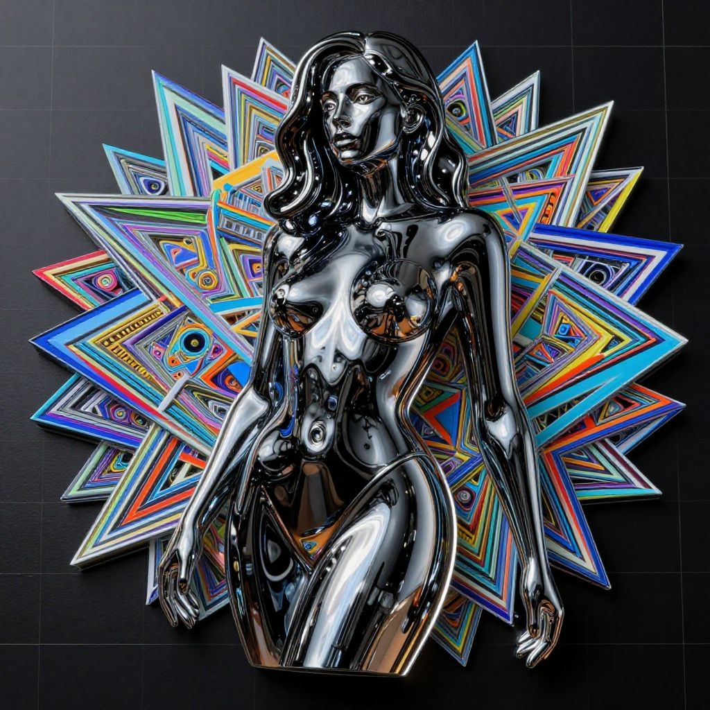 Jet-black and shiny chrome smooth streaming sharp focused glassy Murano liquid art glass outlining the form of a captivating 18yo woman, highly detailed 8k crisp quality hdr acrylic art ultra realistic, technicolored liquid, 3d shading, incredible detailed, stunning work of art, unforgettable masterpiece