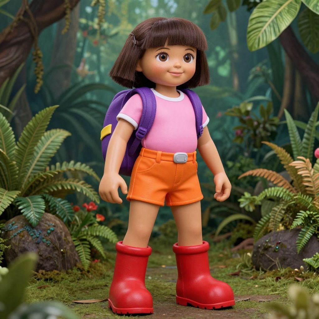Photograph of a smiling doll with brown hair, wearing yellow shirt, orange pants, red boots, and purple backpack, standing on a forest path surrounded