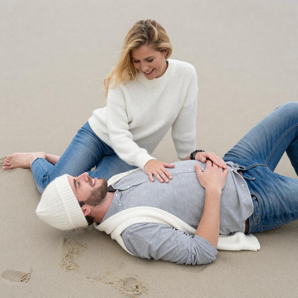 Photograph of two people on a sandy beach. Blonde woman in white knit sweater and blue jeans, smiling, leans over pregnant man in gray button-up shirt, blue jeans, white cardigan, and white knit hat, lying on sand, smiling back. Man's hand rests on belly. Woman's hand on man's stomach. Both barefoot. Sandy background.