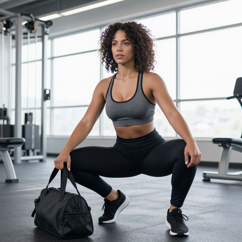 Photograph of a fit, curly-haired woman with medium brown skin, squatting in a bright, modern gym. She wears a gray sports bra, black leggings, and black sneakers, holding a black gym bag in her left hand. The background shows large windows, gym equipment, and a weight bench. Her focused expression and athletic build are prominent. The gym has a clean, minimalist design.