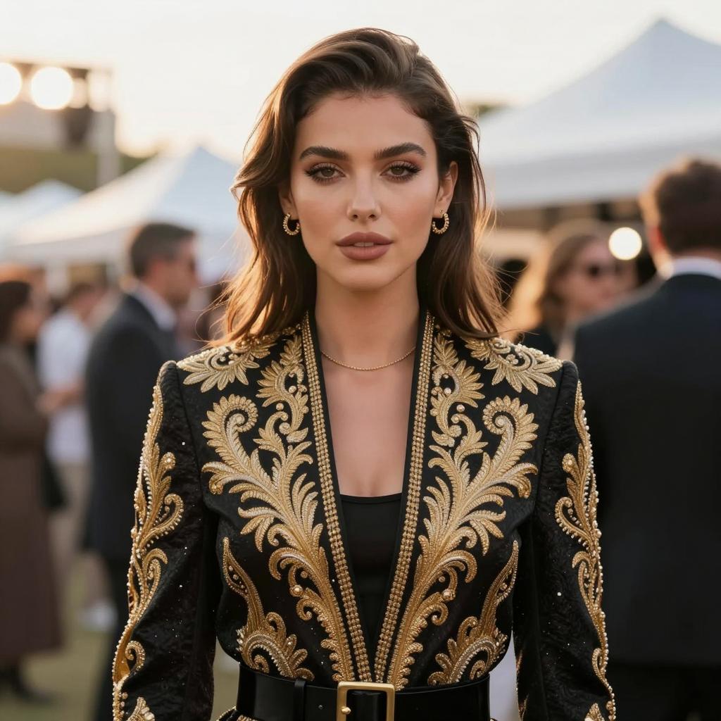 A confident woman poses in designer clothing at a fashion festival, showcasing a luxurious black jacket with intricate gold embroidery. The warm backlight highlights her styled hair and elegant accessories, capturing the essence of sophisticated fashion in a vibrant outdoor setting.