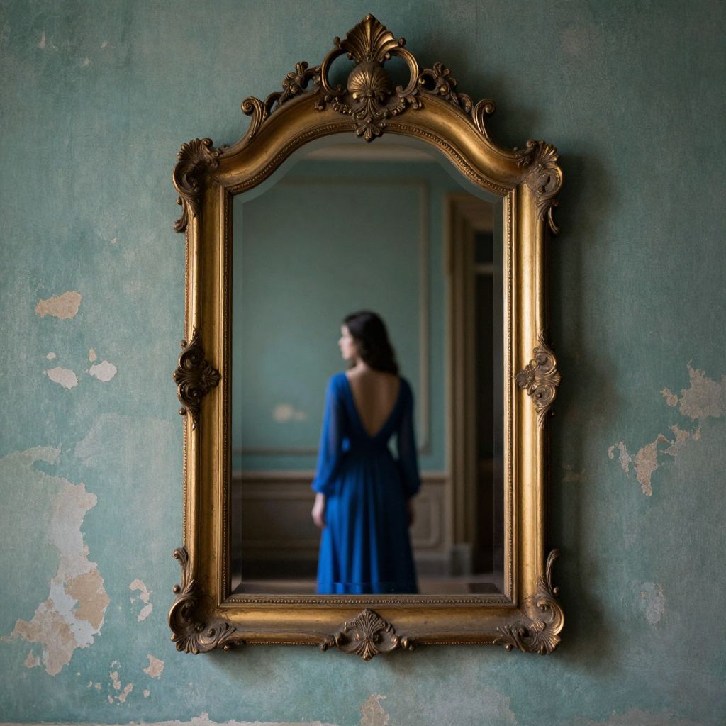 Elegant gold-framed mirror hangs on a weathered teal wall, reflecting the back of a woman in a flowing blue dress, her silhouette framed by intricate carvings and flanked by peeling plaster, evoking a sense of timeless mystery and introspection.
