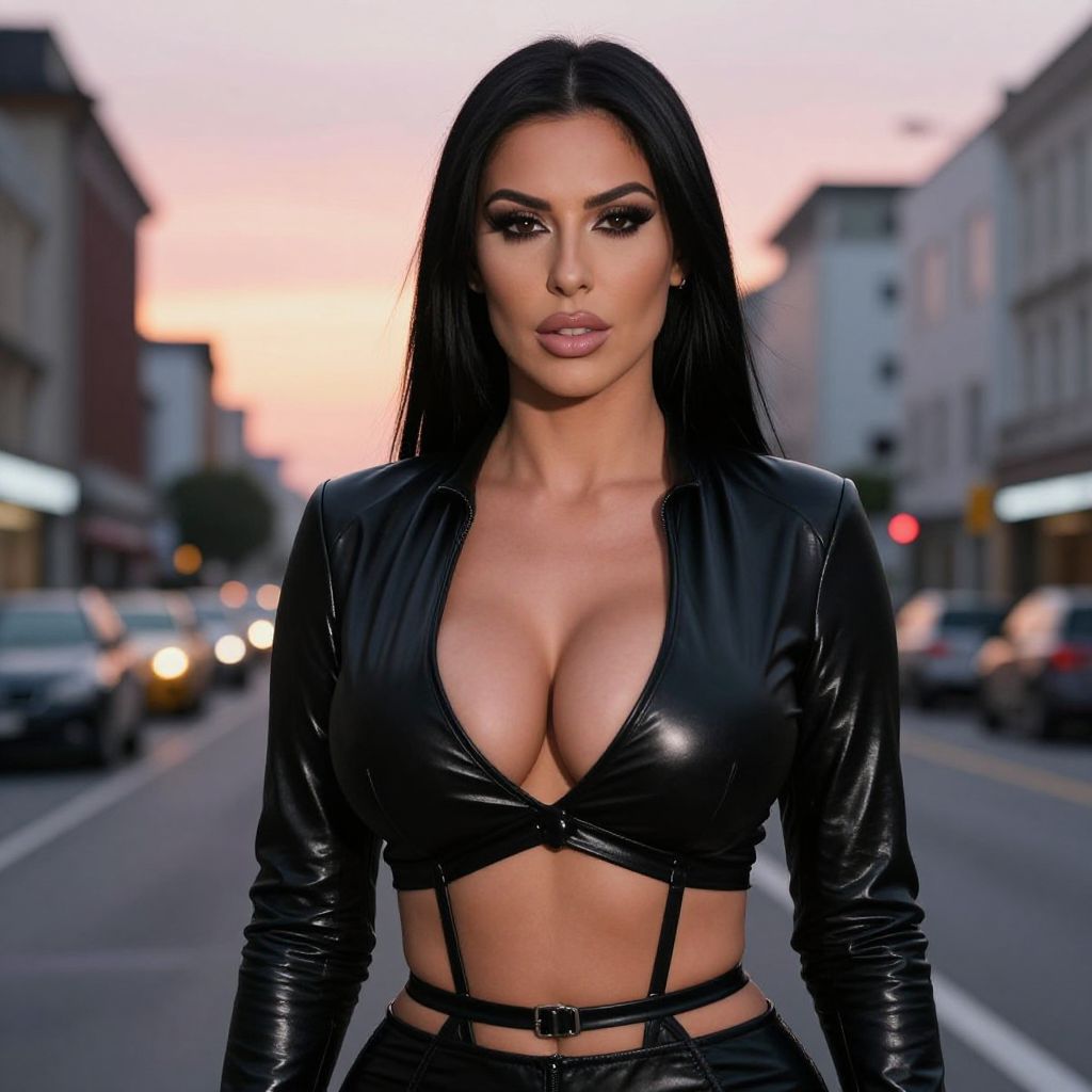 Photograph of a woman with long, straight black hair and dark, intense eyes standing on an urban street at sunset. She's wearing a black, shiny, tight-fitting leather outfit with a deep V-neck that highlights her large breasts, and strappy details around her midsection. The blurred cityscape in the background features buildings with soft, pink and orange lighting from the setting sun.