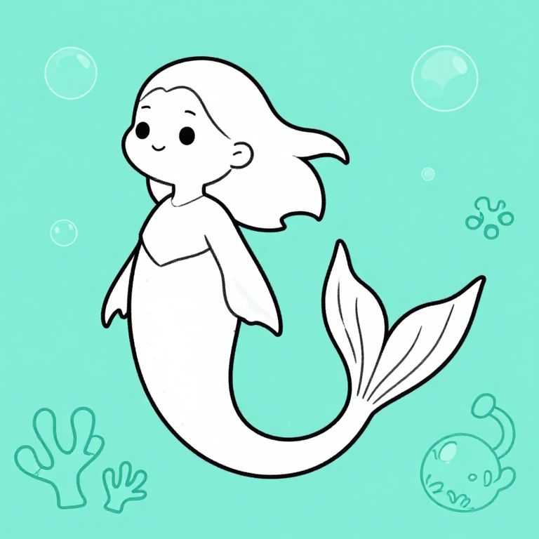 Mermaid drawing outline with bold, clean lines illustrating a serene aqua-themed concept, featuring long tail and flowing fins, surrounded by subtle bubbles and coral sketches, perfect for a coloring book design.