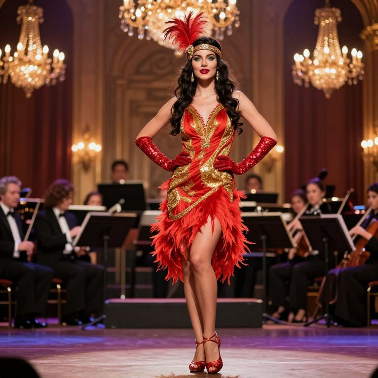 A glamorous 1920s Ziegfeld girl showgirl in a stunning red and gold feathered dress, standing on a grand illuminated stage with glittering chandeliers and a live orchestra in the background, her long dark hair flowing freely, full red lips, sharp cheekbones, and bright green eyes, wearing ornate feathered headpiece and sequined gloves, high heels clinking on the stage floor