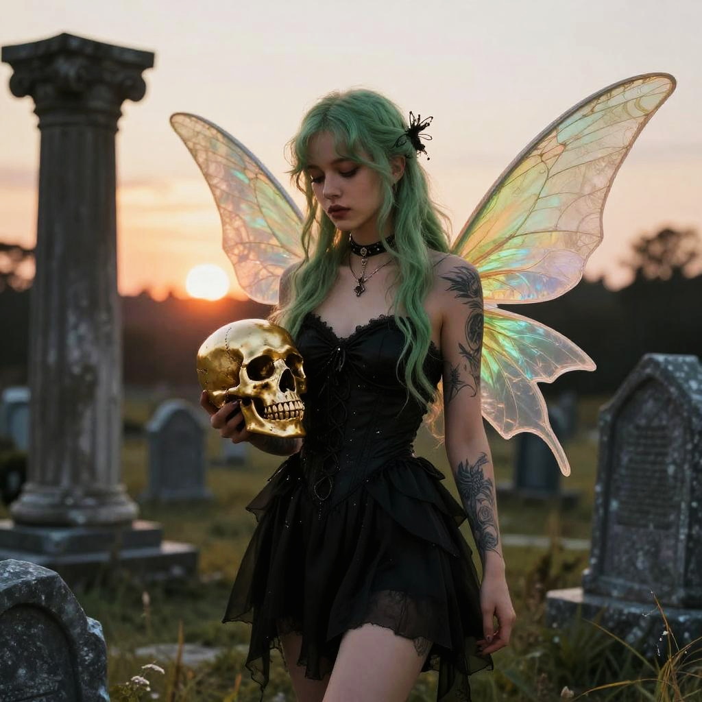 A digital artwork of a green-haired fairy woman with translucent wings, holding a golden skull. She's wearing a black, strapless dress and a choker, with detailed tattoos on her left arm. She's in a graveyard with ancient stone pillars and a sunset sky in the background. Her expression is pensive, and the fairy wings have a delicate, ethereal texture.