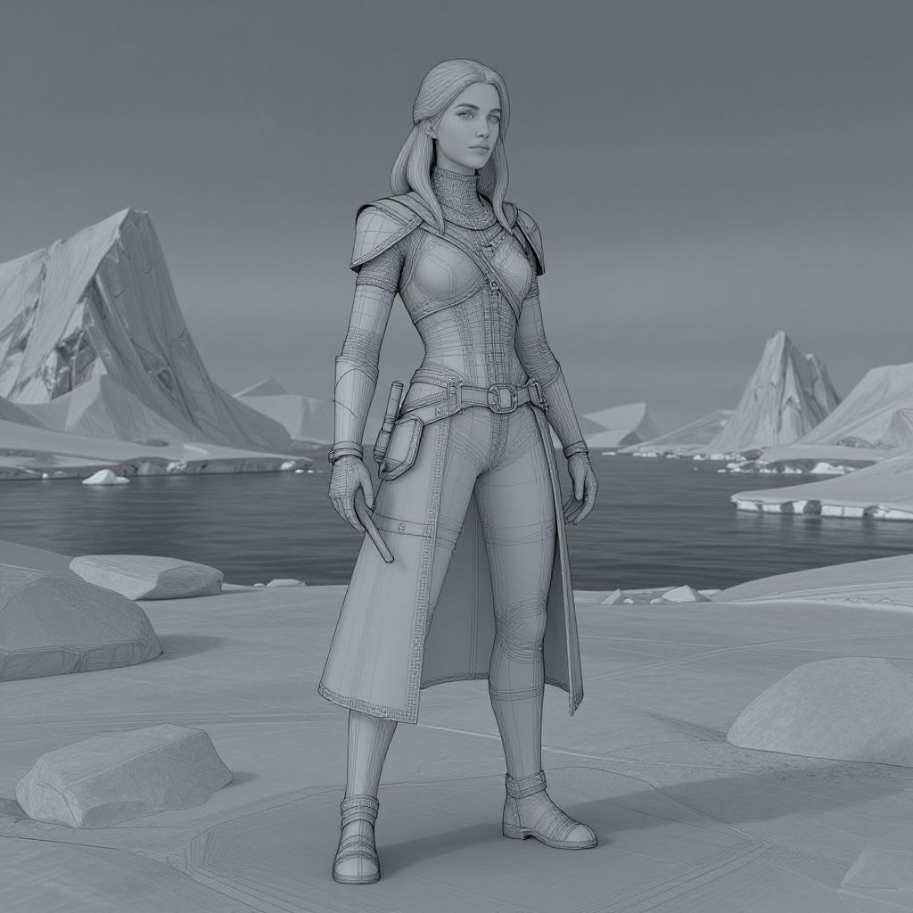 Wireframe Model agnes baker in antarctic landscape, arkham horror illustration, character in center,