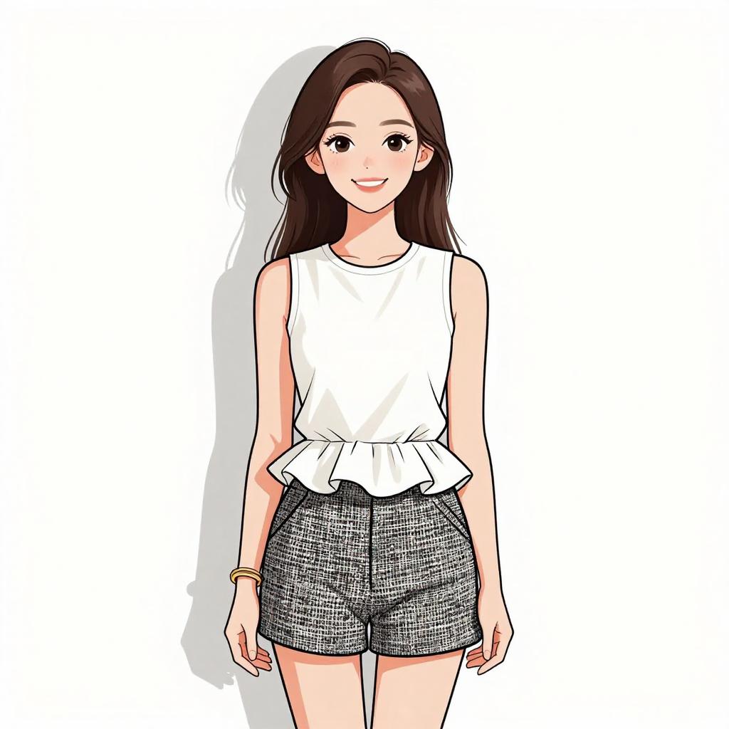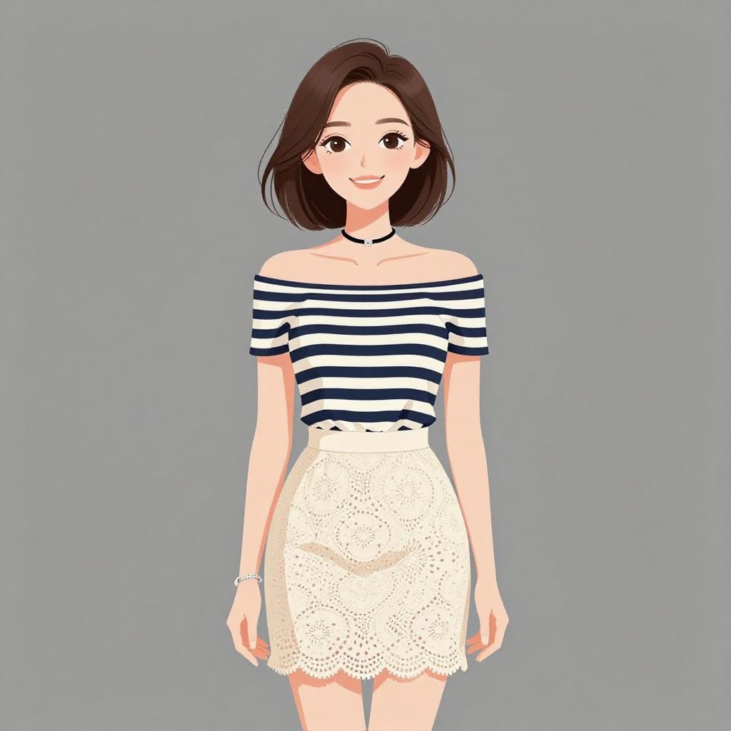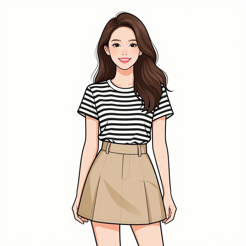 Woman with pretty face and pretty hair. smiling Woman, casual summer style, cropped short-sleeve top with horizontal black and white stripes, round neckline, high-waisted skater skirt in solid khaki color, soft pleats, mini-length, natural makeup with bold pink lip color, long wavy hair, plain white background. --sref 1467