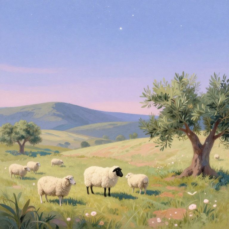 Digital illustration of a sunny, green pasture with grazing sheep, an olive tree, and rolling hills under a clear blue sky.