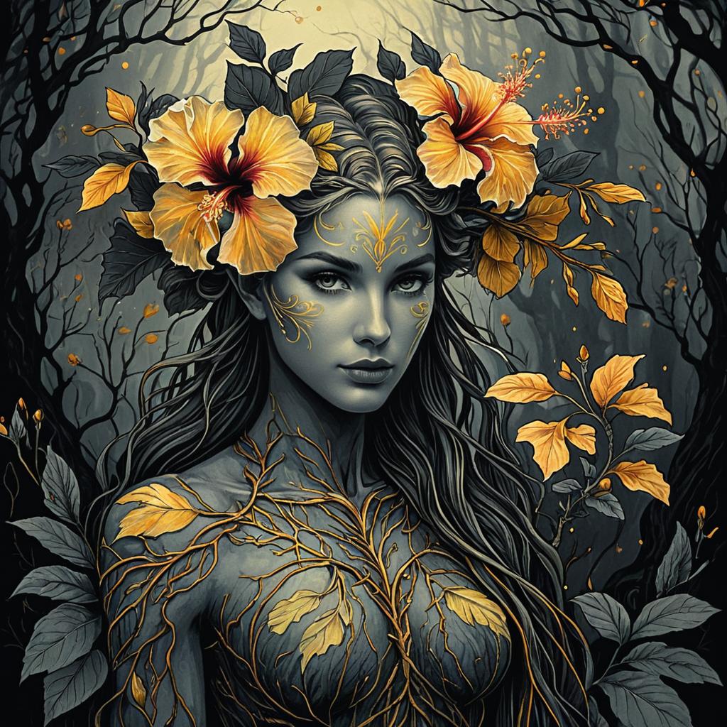 An ephemeral dryad adorned with delicate hibiscus, rendered in a colored ink art style. Intricately detailed and shaded in hues of yellow, orange, and grey, set in a dark, broody atmosphere. The artwork captures a whimsical yet haunting beauty, with fine linework and soft, ethereal tones that emphasize the delicate, almost translucent presence of the dryad.