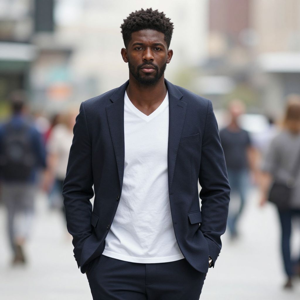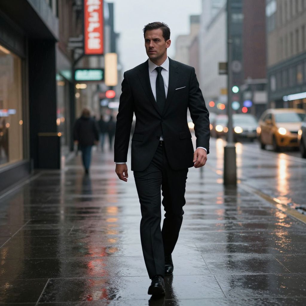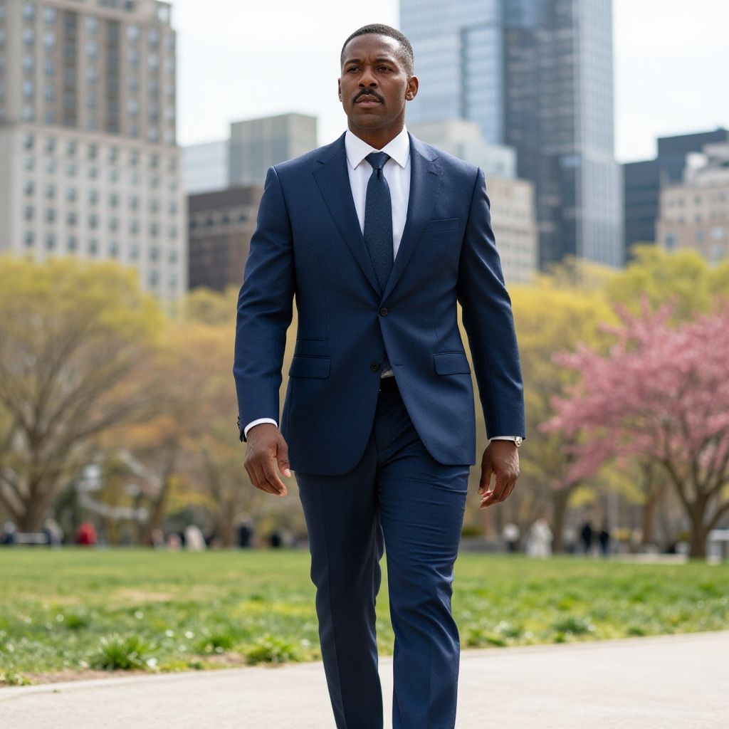 Black man with a mustache, dressed in a sharp tailored suit, walking through a modern urban park with skyscrapers in the background, vibrant spring colors, high detail