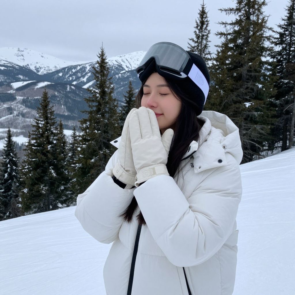Woman snowboarding in winter, wearing a white down-padded coat and cream-colored mittens, her eyes closed in joy as she holds her hands together near her face, surrounded by snowy mountains and evergreen trees in the background.