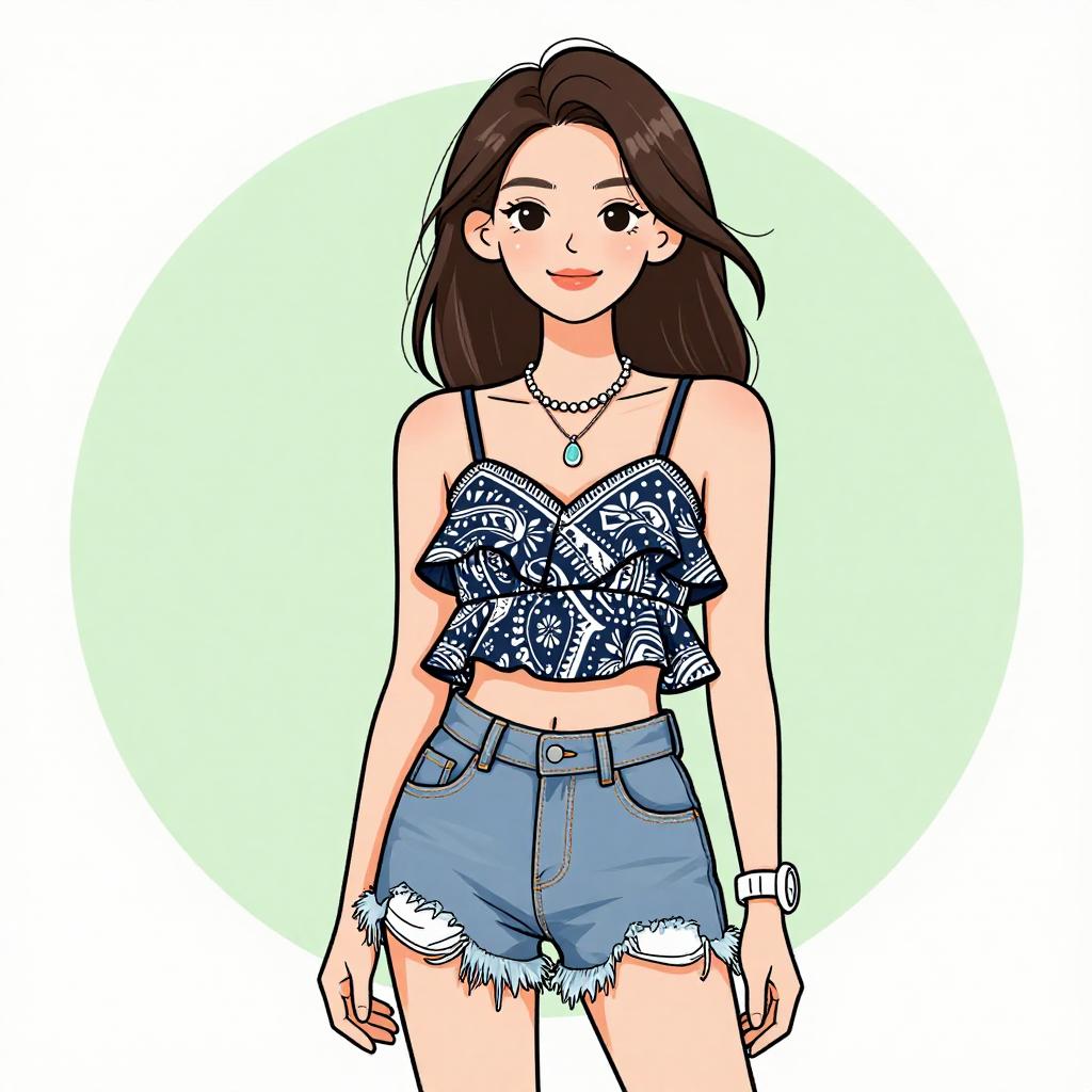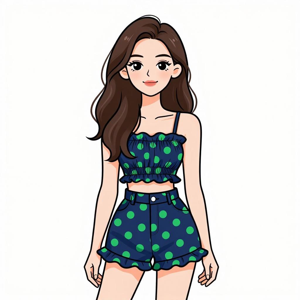 Woman with pretty face and pretty hair. smiling Woman, casual summer style, smocked crop top with straight neckline, navy blue with green polka-dots, matching high-waisted shorts, ruffled hem, white studio background --sref 1467