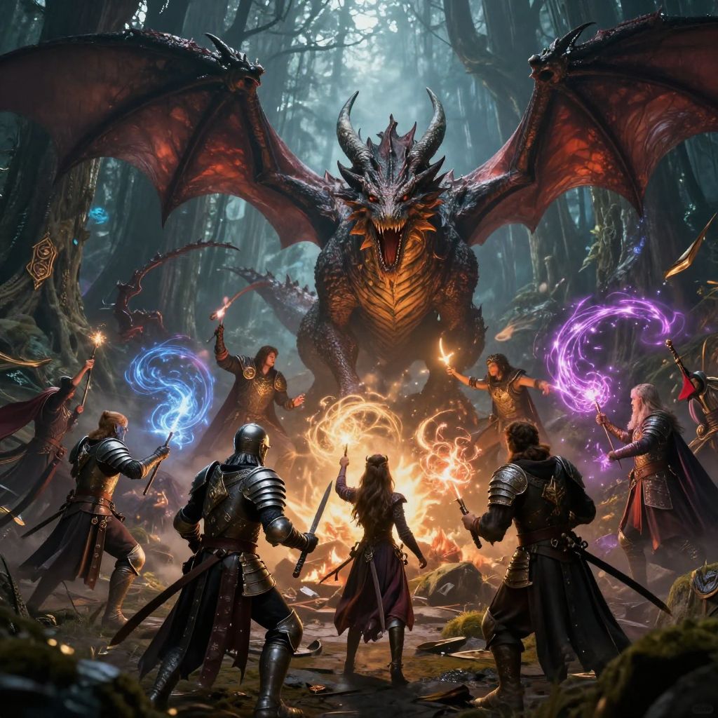 DND AI art illustrating an epic battle between elven archers and goblin hordes in a ruined temple, enchanted arrow trails glowing bright green, ancient stone statues crumbling, mist swirling around, a fusion of classical fantasy and futuristic AI aesthetics, richly textured.