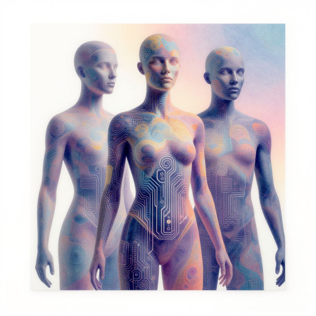 Photograph of three nude, bald, female humanoid figures standing side by side against a gradient background of pink, blue, and white. Their skin is digitally overlaid with intricate, circuit-like patterns. The central figure is slightly taller, with a neutral expression, while the left and right figures have subtle, contemplative expressions. The figures have small breasts and are depicted with androgynous features. The background gradient adds a futuristic, cybernetic feel to the image, emphasizing the circuitry patterns on their skin. The overall style is a blend of science fiction and digital art.