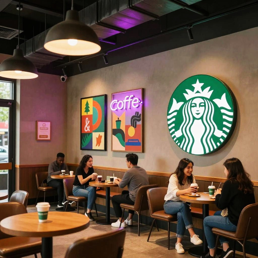 Starbucks aesthetic vibrant coffee shop interior with neon signs, colorful wall art, comfortable seating, customers chatting, lively and trendy ambiance