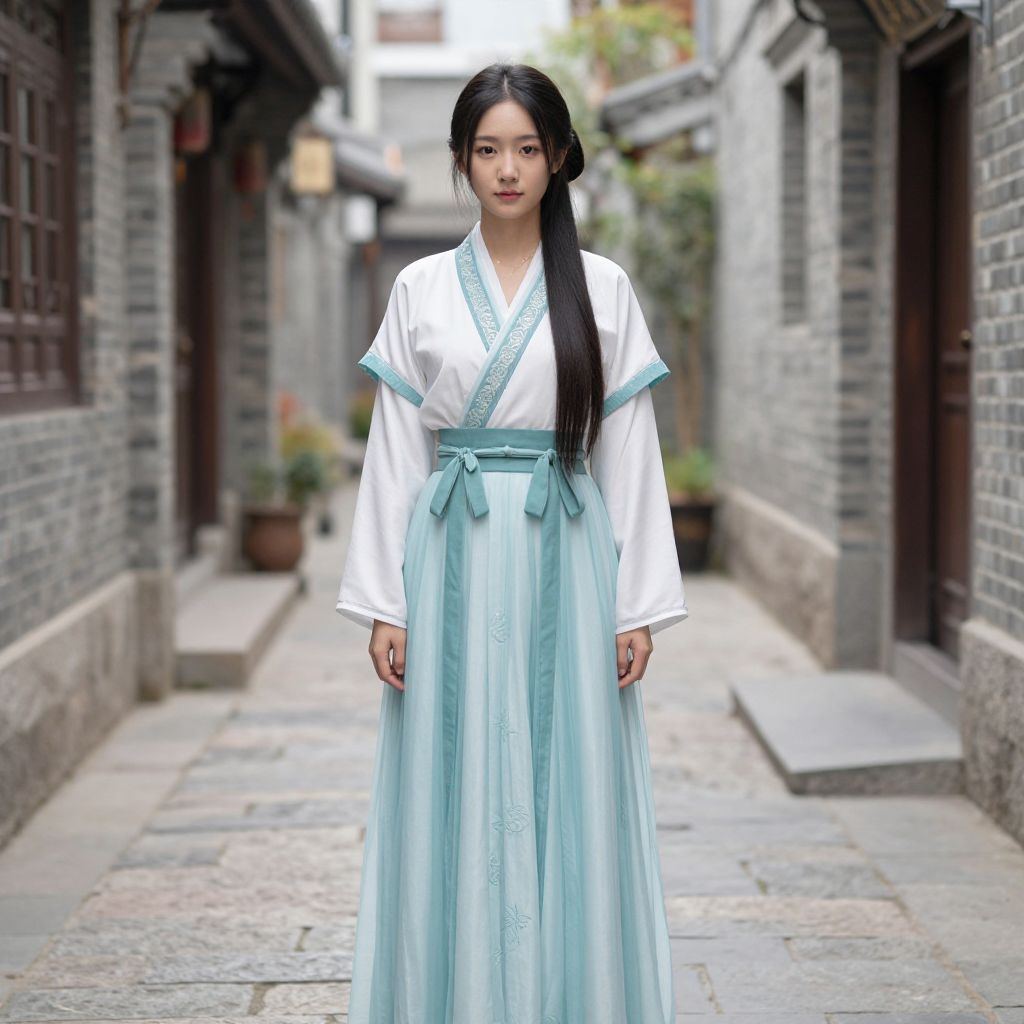 Photograph of an Asian woman with long black hair, wearing a white and light blue traditional Korean hanbok, standing in a narrow, stone-w