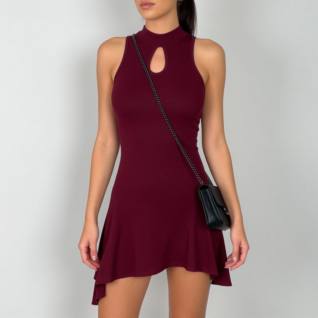 "Woman, chic, sleeveless ribbed skater dress in burgundy, high neckline, keyhole shoulder cut-outs, flared skirt with an asymmetrical hem, mid-thigh length, black chain-strap crossbody bag, simple makeup, hair in a high, casual ponytail.. Sexy. Pretty face and beаutiful eyes. Big breasts."