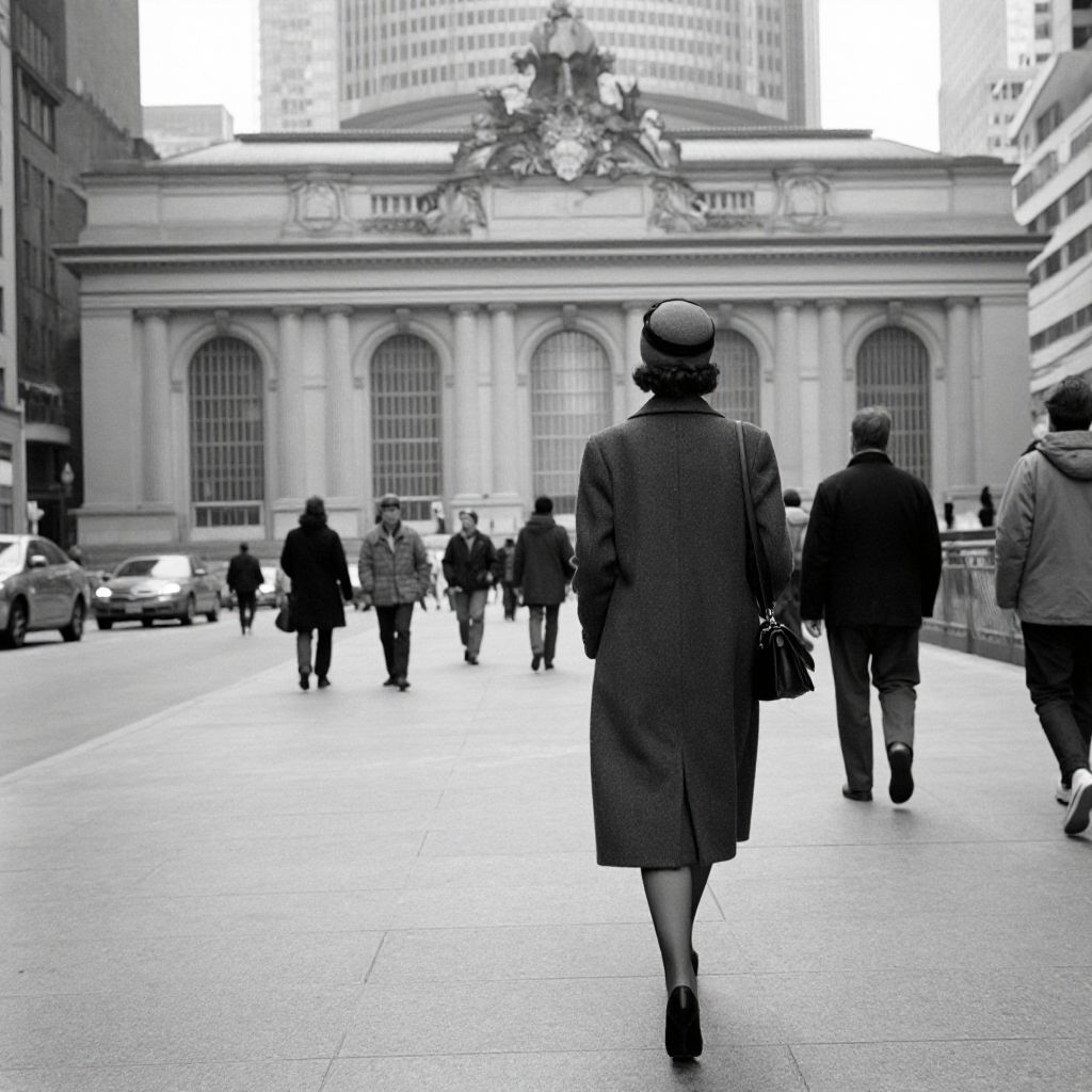 A black-and-white street scene captures a woman in a classic coat and hat walking away from the camera toward Grand Central Terminal on 43rd and 5th Avenue, reminiscent of Stanley Kubrick's cinematic style for LOOK magazine in 1946, with a vintage, high-definition quality that evokes mid-century urban life.