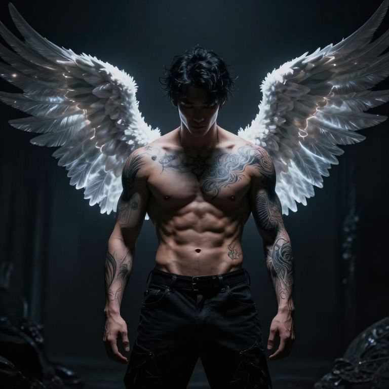 A muscular figure with glowing wings and intricate tattoos stands in a dark, ethereal setting, embodying the duality of light and darkness.