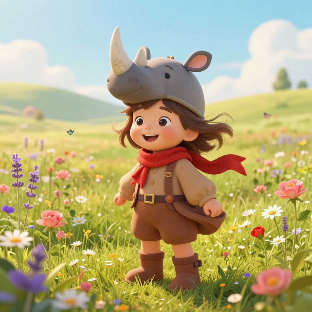 A happy, playful child with bright, curious eyes and a warm smile, wearing a cozy brown outfit featuring a red scarf and knee-high boots, stands in a sunny meadow filled with vibrant flowers such as daisies, wild roses, and lavender. A large, whimsical rhinoceros hat sits on their head, slightly tilted as if they're giggling and enjoying the breeze. Soft golden sunlight filters through the grass, casting gentle shadows and creating a warm, cheerful atmosphere. The breeze gently lifts strands of their brown hair and the edges of their clothing, adding movement and life to the scene. The background features a distant hill with a soft gradient of green and blue, and a few butterflies fluttering nearby, enhancing the lively, joyful mood. The overall tone is bright, nostalgic, and full of innocence and joy.