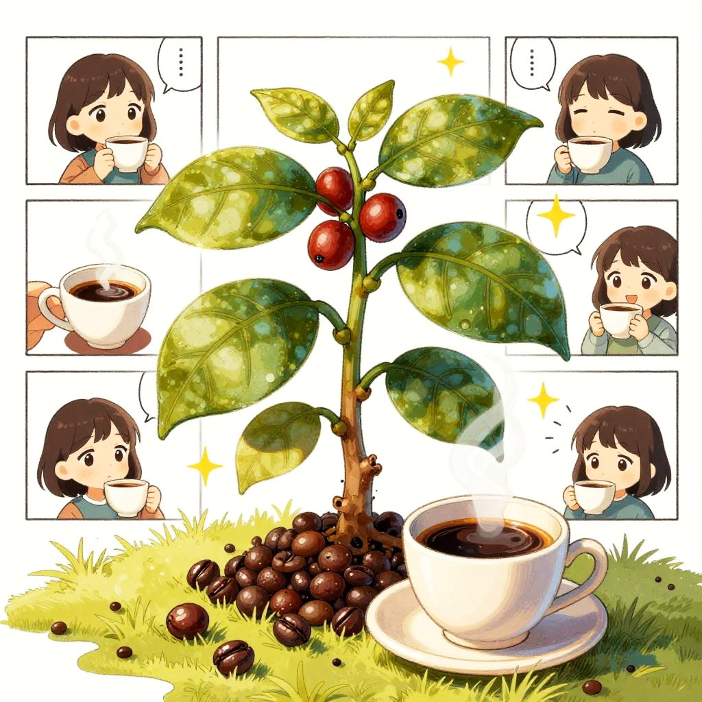 This digital anime-style illustration features a young girl with short brown hair and wide eyes, depicted in six small panels around a central scene. The central image shows a coffee plant with glossy green leaves and red coffee cherries, surrounded by coffee beans on the grass. In the foreground, a white cup of coffee sits on a saucer. The panels show the girl holding a cup of coffee, her expressions ranging from surprise to delight, with sparkling effects emphasizing her enjoyment. The background is white, highlighting the vivid colors of the plant and coffee.